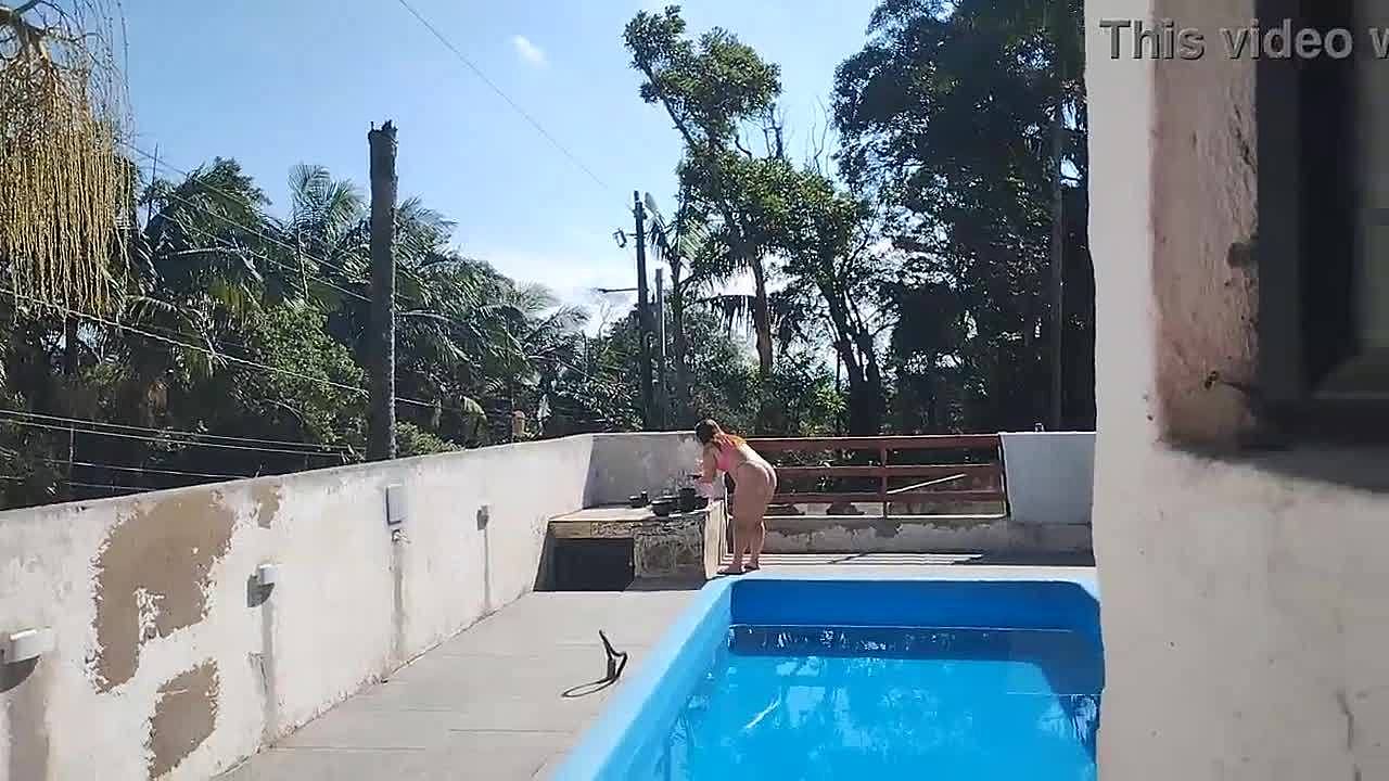 Chamei o pedreiro no domingo pra terminar um serviço na piscina mais fiquei preparada bem putinha esperando logo ele bateu uma punheta e gozou pra mim