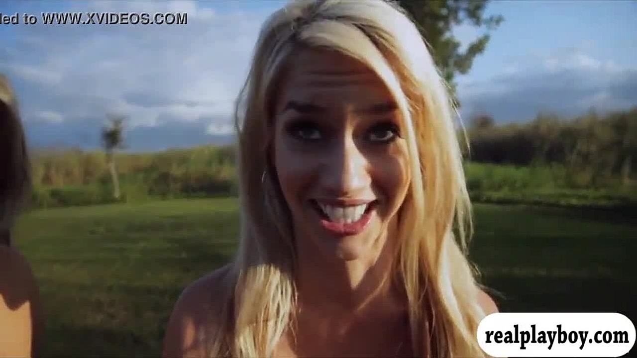 Brunette and Blonde Models Strip Outdoor Showing Shaved Pussy